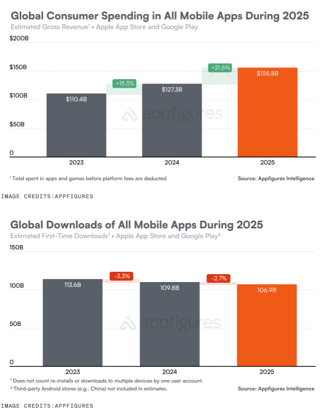 Perhaps the most striking takeaway is that consumer spending rose approximately 21.6 % to nearly $156 billion in 2025, despite fewer downloads.